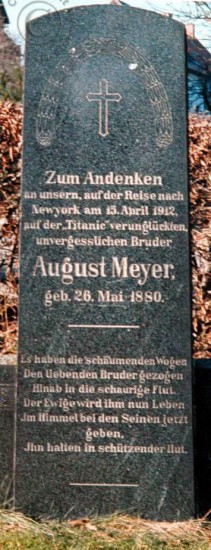 Am 10. April 1912 wurde August Meyer dennoch von seinem Bruder nach Southampton begleitet und trat seine Reise auf der Titanic an. Der unverheiratete Konditor hatte für das Ticket der Zweiten Klasse 13 £ bezahlt. Als Ziel hatte August Meyer New York City angegeben. Kurioserweise machte August Meyer wenige Tage vor seiner Abreise sein Testament.