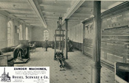 Zu den viel angepriesenen Neuheiten der Titanic gehörte unbestritten der Gymnastikraum. Er lag auf der Steuerbordseite des Bootsdecks neben dem zweiten Schornstein.