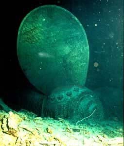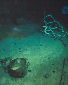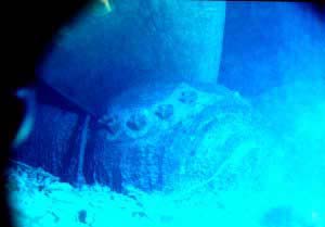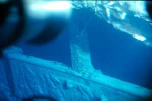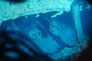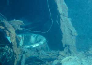 Die Steuerradaufhängung ist das einzige, was vom Ruderhaus noch steht. Sie ist nicht aus Eisen und rostet daher nicht. Links im Bild: Eine Gedenkplakette mit Plastikblumenstrauß und US-Fahne, die bei einer Tauchfahrt angebracht wurden.
