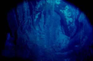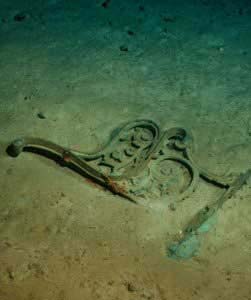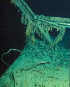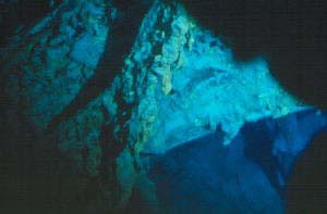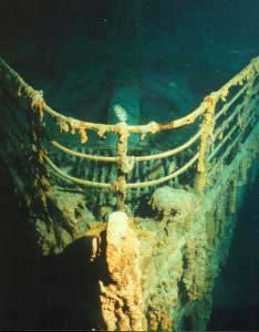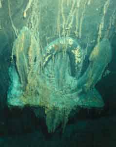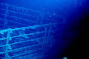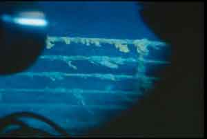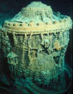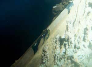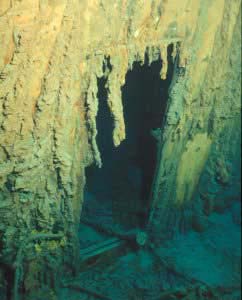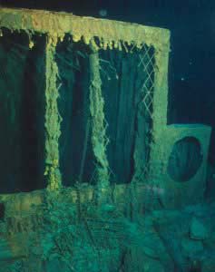Ein Stück Reling vom Vorschiff. Die Ausrichtung der Rostzapfen (Rusticles) zeigt, welche Strömungsverhältnisse an dieser Stelle herrschen.