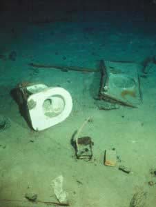 Die Badewanne des Kapitäns. Dahinter das Waschbecken. Die Wände des Quartiers, das direkt hinter der Brücke lag, sind bereits eingestürzt.