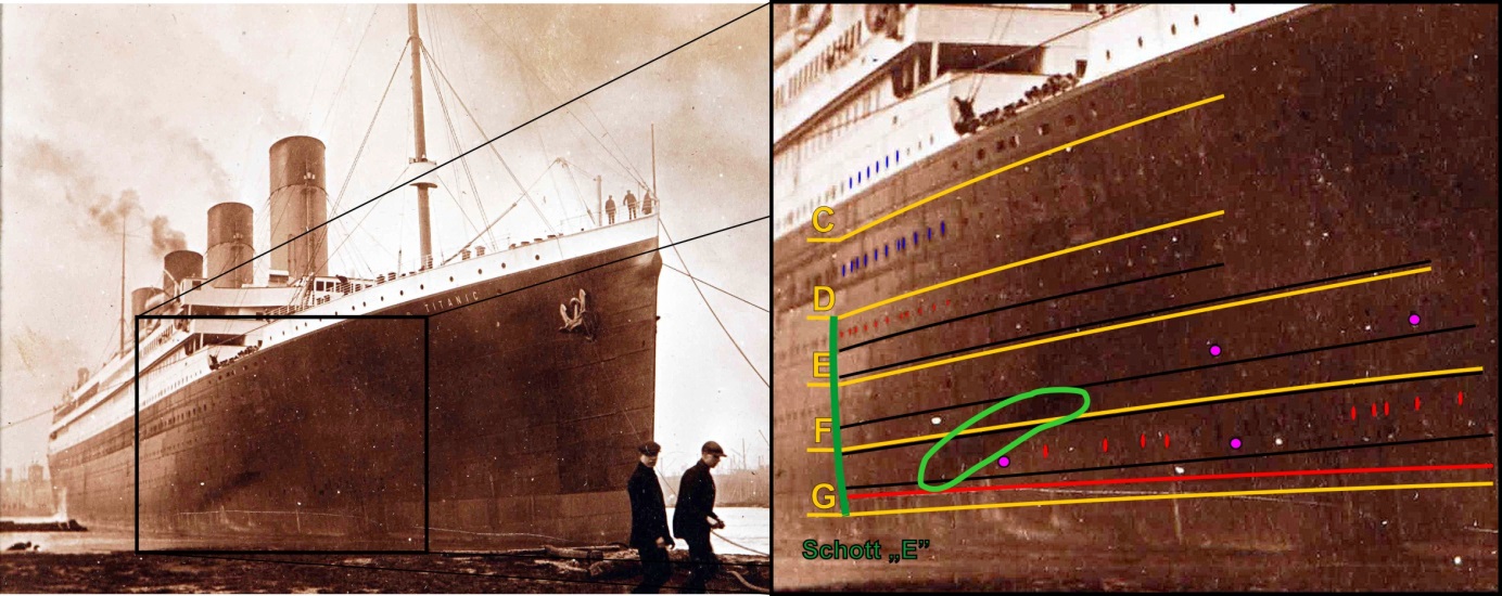 Bei einer genaueren Analyse der Aufnahme lässt sich mithilfe der Lokalisierung von Bullaugen und der Anordnung der Stahlplatten der genaue Ort des mysteriösen schwarzen Flecks am Rumpf bestimmen. Durch einen Abgleich mit den Originalplänen können in der Aufnahme auch die Decks, sowie das angeblich gefährdete Schott „E“ zwischen Kesselraum Nummer 5 und 6 genau eingezeichnet werden.