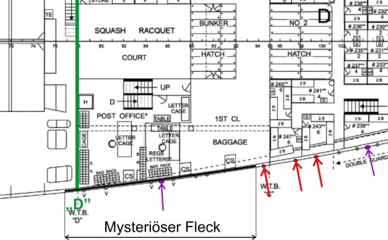 Wie im Ausschnitt zu erkennen, befindet sich der mysteriöse schwarze Fleck zwischen Deck F und Deck G und nicht in der Nähe vom Schott „E“. Markant sind auch die Anordnung der rot eingezeichneten Bullaugen, sowie die violett eingefärbten Aussparungen für Taue. Mit ihrer Hilfe lässt sich der Ort des Flecks auf Deck G exakt feststellen. Die dahinter liegenden Räumlichkeiten sind in Bruce Beveridges Deck Plan eingezeichnet. Im Plan sind die markanten Bullaugen zur besseren Orientierung mit roten Pfeilen versehen.