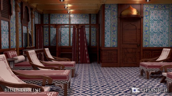 - Erste Klasse: Turnhalle, Türkisches Bad, Squash-Raum, Schwimmbad, großes Treppenhaus, Rauchsalon, Veranda und Palmengarten, Café Parisien, A-la-carte-Restaurant, Lounge, Speisesaal, Empfangshalle, die beiden Suiten mit zwei Schlafzimmern, einem eigenen Bad, Wohnzimmer mit Kamin und Privatpromenade