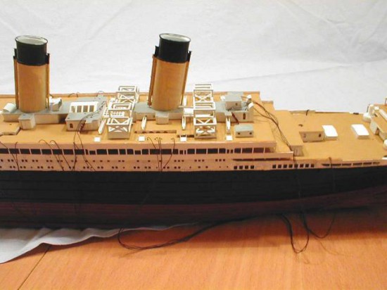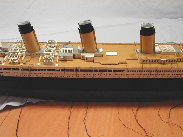 Wenn diese Arbeit erledigt ist, dann ist das „Schlimmste“ geschafft. Es fehlen jetzt nur noch die Reling und die Takelage, die sich vor allem beim hinteren Mast von der Olympic und Titanic unterschieden. Auch diese Unterschiede sind auf vielen Fotos (vor allem beim Riggingplan) gut zu erkennen.