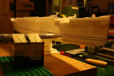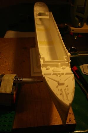 Bild 14: Alle Bullaugen sind in den Rumpf gebohrt. Die Relingteile auf den Decks sind auch entfernt.