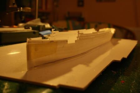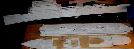 Bild 1: Der provisorisch zusammengesetzt Rumpf des Titanic-Modells mit den Teilen für das Vorder- und Achterdeck.
