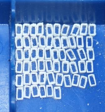 Im Fachhandel holte ich mir einen hohlen(!) Rechteckstab aus Kunststoff mit den Maßen drei mal vier Millimeter. Aus diesem Stab sägte ich vorsichtig eine ganze Masse von Scheiben mit einer Stärke von einem Millimeter ab (siehe Bild 15). Da der Stab ja hohl war, erhielt ich mit den Scheiben gleichzeitig einen Rahmen (siehe Bild 16). Jeder einzelne Rahmen musste natürlich intensiv und sorgsam bearbeitet werden, da das weiche Kunststoffmaterial sehr grobe Schnittkanten aufwies.