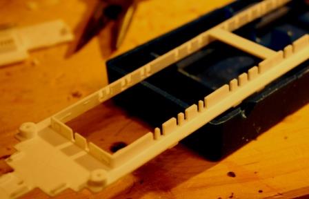 Beginnen wir mit den einfachsten Eingriffen an den beiden Rumpfteilen (Teile-Nr. 5 und 6). Hier muss die Reling des Vorder- und Achterdecks entfernt werden. Mit einer Säge wird das eine ziemlich mühselige und unsichere Arbeit, weil man leicht in Bereiche des Bauteiles hineinsägen kann, die unberührt bleiben sollten.