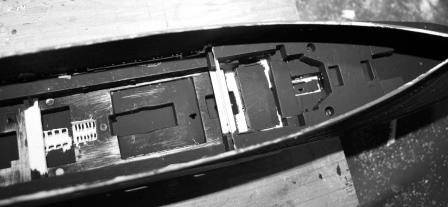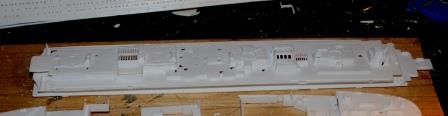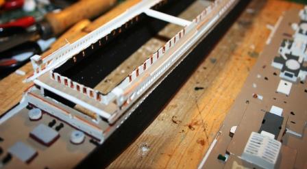 Bild 11: Bootsdeck nach dem Entfernen der Relingteile. Zustand lackiert und Rohbau. Das Dach der Offiziersunterkünfte ist noch nicht verklebt.