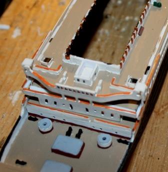Bild 9: Teil 14 nach dem Umbau. Treppenhaus und Rauchsalon der 2. Klasse sind „getrennt“. Das Deck zwischen diesen Aufbauen ist schon einzogen; Treppen und Reling sind entfernt.