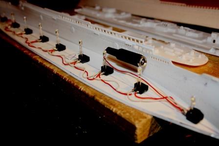 Für die ersten Beleuchtungstests habe ich 10 LED´s stehend eingebaut (siehe Bild 4); das Ergebnis war aber wegen des ungünstigen Abstrahlwinkels nicht so befriedigend, da die Leuchtdiode eben hauptsächlich nach oben, und weniger nach den Seiten strahlt (wie eine Glühbirne). Also habe ich pro Sockel eine zweite LED eingeschraubt, die ich im rechten Winkel zur Seite gebogen habe, damit sie mit ihrer Oberseite dann direkt von innen die Rumpfseite anstrahlt. Auf den Fotos ist das ganz gut zu erkennen (siehe Bild 5). Da der geplante Aufstellungsort meines Modells so ist, dass nur eine Seite sichtbar sein wird, habe ich nur für diese Seite die zusätzlichen LED´s eingebaut. Die andere, nicht sichtbare Schiffsseite bleibt schlechter ausgeleuchtet. Hier geht mir Ökonomie vor Perfektion!