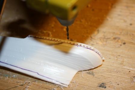Nun setzen wir den Rumpf auf eine stabile Polystyrolplatte und zeichnen mit dem Filzstift die inneren Konturen des Rumpfes nach. Die Polystyrolplatte entsprechend aussägen und so anpassen, dass die Platte in den Rumpf passt. Mit Sekundenkleber können wir jetzt schon die Sockel für die LED´s aufkleben und die Verkabelung der Sockel vornehmen. Die LED´s werden in den Sockeln verschraubt, die Kabel müssen aber meistens angelötet werden. Da kommt man leider nicht herum. Wer noch nie weich gelötet hat, bitte den kleinen Exkurs durchlesen.