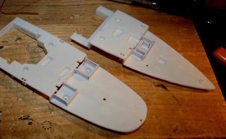 Bild 8: Die Bauteile 7 (Achterdeck) links und Teil 8 (Vorderdeck) rechts nach den Umbauten, noch im Rohzustand. Die Bauteile liegen auf dem Kopf; zu sehen sind die zusätzlichen Wände (noch ohne Decks).